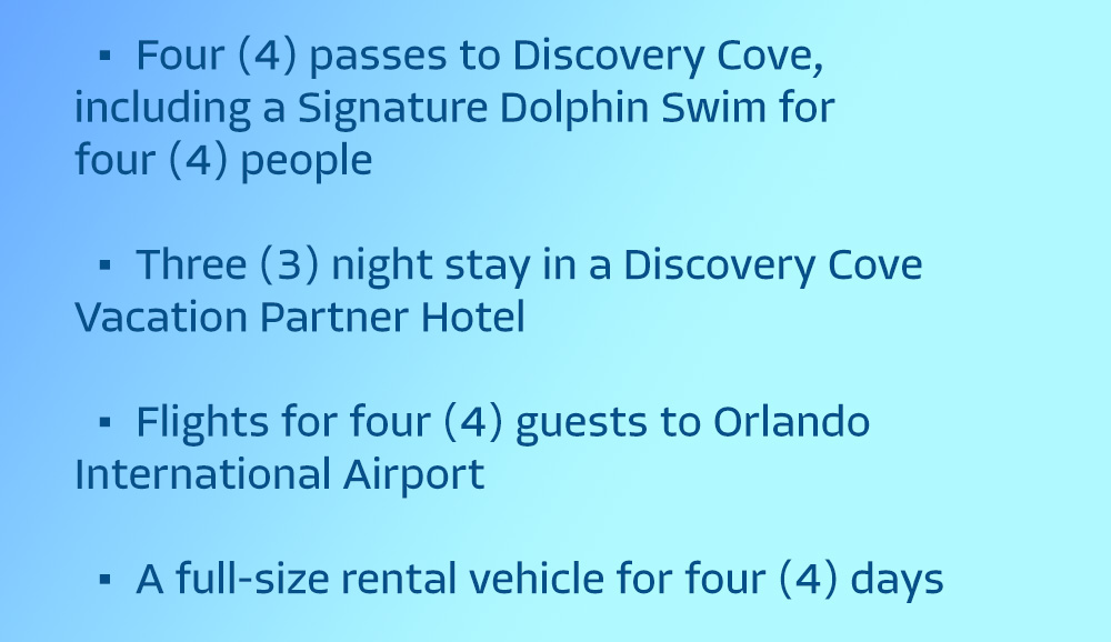 Discovery Cove Orlando is an all-inclusive day resort where guests can enjoy a one-of-a-kind opportunity to swim with dolphins, snorkel among thousands of tropical fish and rays, hand-feed hundreds of exotic birds, encounter playful otters and more. Relax and explore turquoise lagoons surrounded by lush landscaping, colorful reefs, winding rivers and white, sandy beaches.