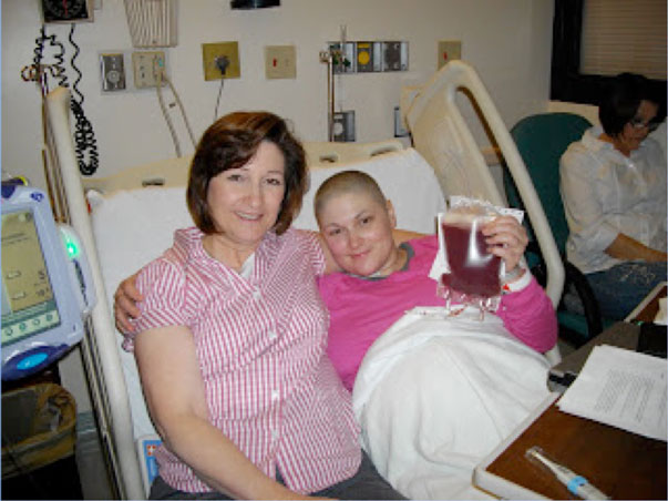 Katie with her mom, day of the transplant, holding her stem cells from Germany