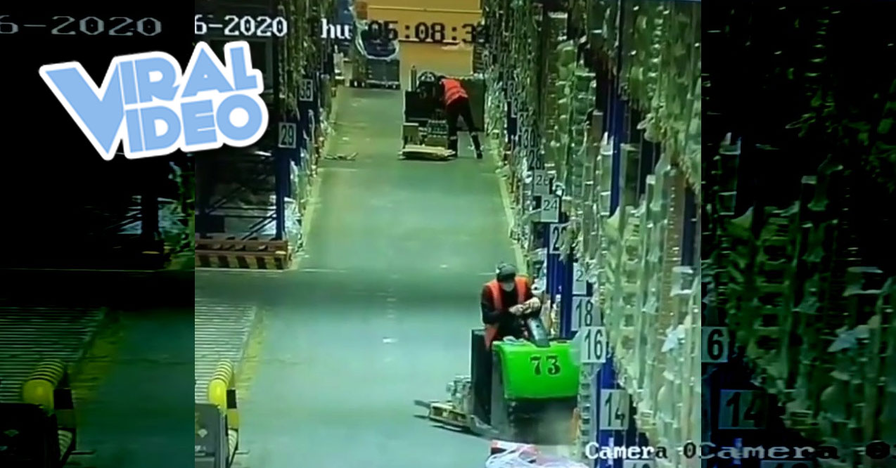 Man takes a nap on a fork lift truck and takes down a wall of merchandise… Don’t sleep on the job!