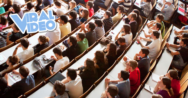 During a lecture at the University of Washington a student who was sleeping behind the projection screen falls in front of entire class then promptly leaves like nothing happens.